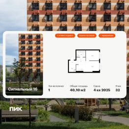 Продаётся 1-комн. квартира площадью 40,1 кв.м на 32 этаже 33 этажного дома (Корпус 2.1.1, Секция 1) проекта ПИК Сигнальный 16. Светлый просторный подъезд на уровне земли, функциональная планировка, большие окна, c отделкой.