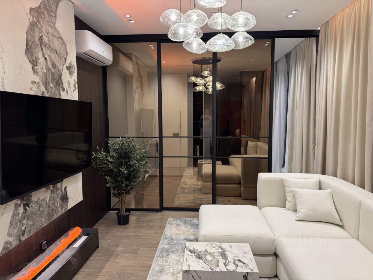 Дорогая отделка, премиальные материалы (Пол -крупноформатный керамогранит с теплыми полом и инженерная доска, потолок - гипсокартон, высокие двери шпон в потолок, вся мебель по индивид проекту).