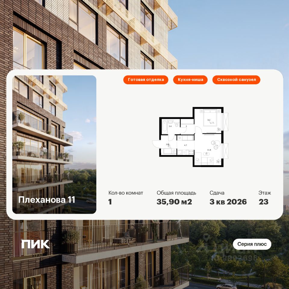 Продаётся 1-комн. квартира площадью 35,9 кв.м на 23 этаже 31 этажного дома (Корпус 1.3, Секция 3) проекта ПИК Плеханова 11. Светлый просторный подъезд на уровне земли, функциональная планировка, большие окна, c отделкой.