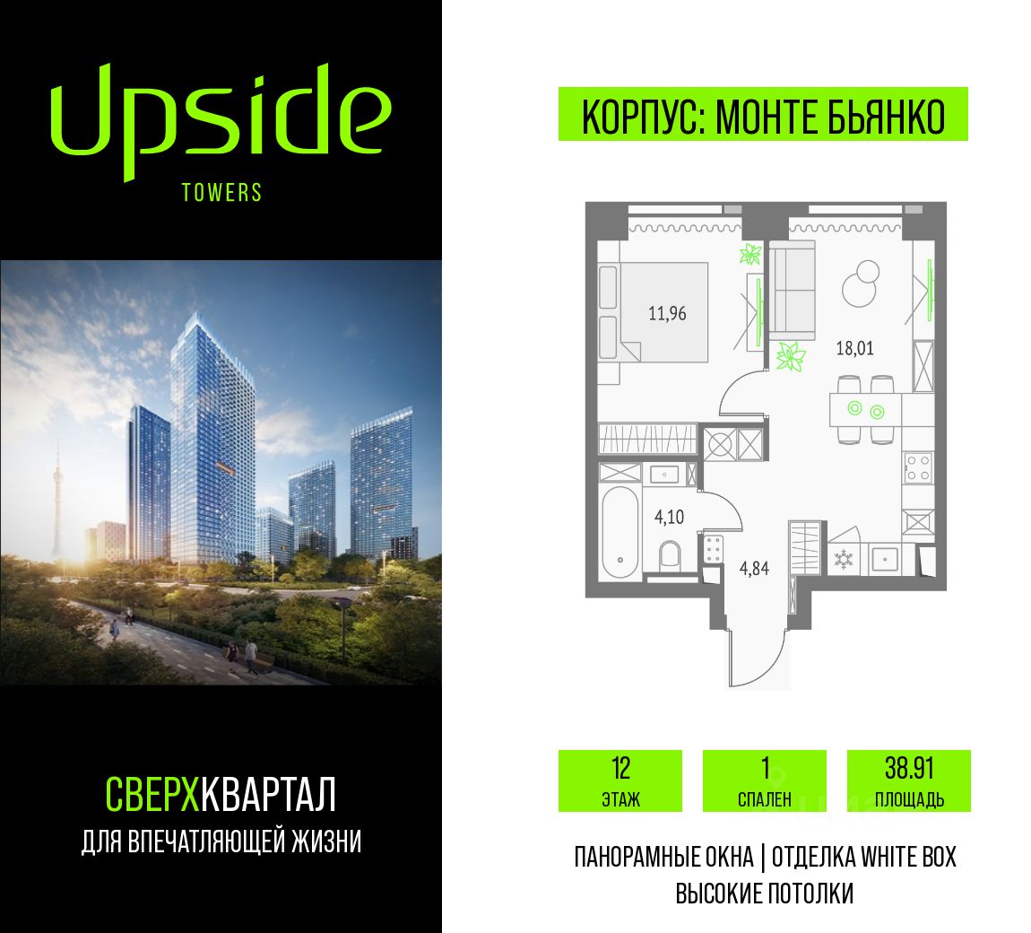 Продаётся 1-комнатная квартира площадью 38.91 кв.м на 12 этаже 46 этажного корпуса Монте Бьянко в квартале небоскребов "Upside Towers". В квартире отделка White-box, c видом на Звездный бульвар, Ольгинский храм, Останкинскую Башню, ВДНХ. Номер квартиры Г1202.