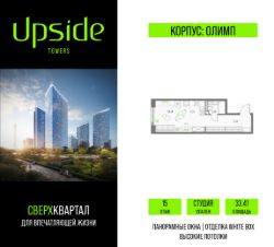 Продаётся студия площадью 33.41 кв.м на 15 этаже 19 этажного корпуса Олимп в квартале небоскребов "Upside Towers". В квартире отделка White-box, c видом на корпус Атлас, корпус Эльбрус, Гранд-плаза, Москва-Сити. Номер квартиры В1501.