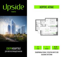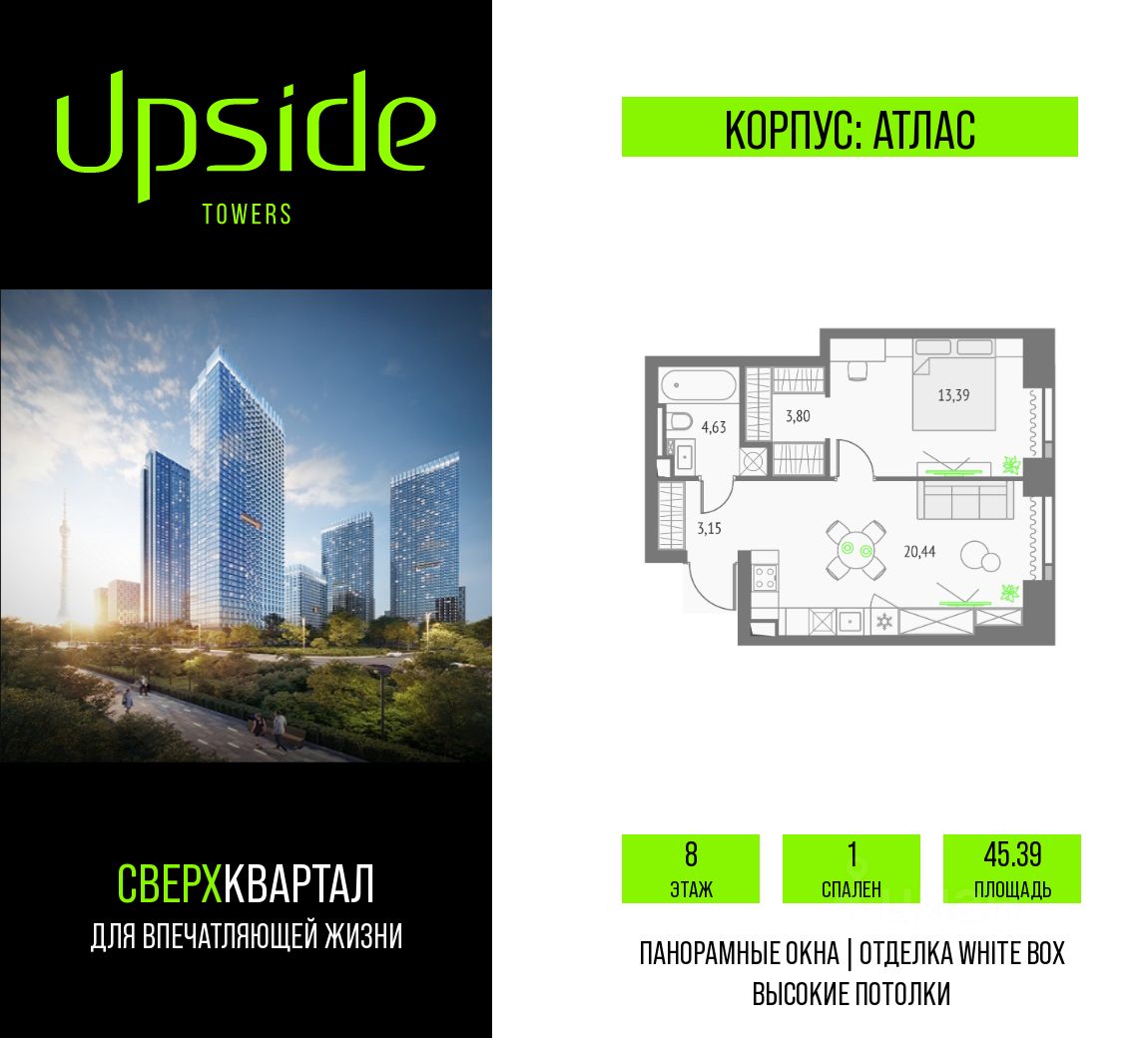 Продаётся 1-комнатная квартира площадью 45.39 кв.м на 8 этаже 47 этажного корпуса Атлас в квартале небоскребов "Upside Towers". В квартире отделка White-box, c видом на корпус Олимп, внутренний двор. Номер квартиры Б0808.