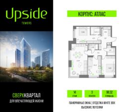 Продаётся 3-комнатная квартира площадью 98.32 кв.м на 14 этаже 47 этажного корпуса Атлас в квартале небоскребов "Upside Towers". В квартире отделка White-box, c видом на внутренний двор, ландшафтный парк, Савеловский сити, Москва-Сити. Номер квартиры Б1414.