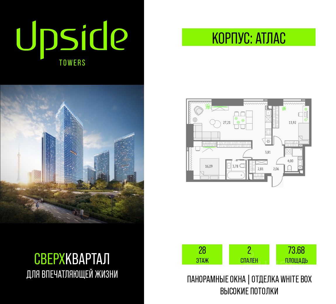 Продаётся 2-комнатная квартира площадью 73.68 кв.м на 28 этаже 47 этажного корпуса Атлас в квартале небоскребов "Upside Towers". В квартире отделка White-box, c видом на корпус Эльбрус, прогулочный бульвар, Савеловский сити, Гончаровский парк, Москва-Сити. Номер квартиры Б2802.