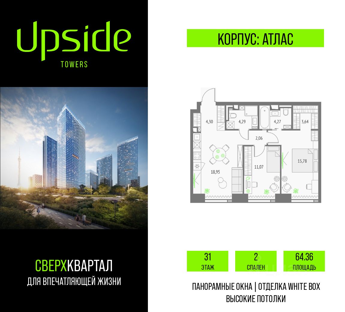 Продаётся 2-комнатная квартира площадью 64.36 кв.м на 31 этаже 47 этажного корпуса Атлас в квартале небоскребов "Upside Towers". В квартире отделка White-box, c видом на внутренний двор, ландшафтный парк, парк Сокольники. Номер квартиры Б3111.