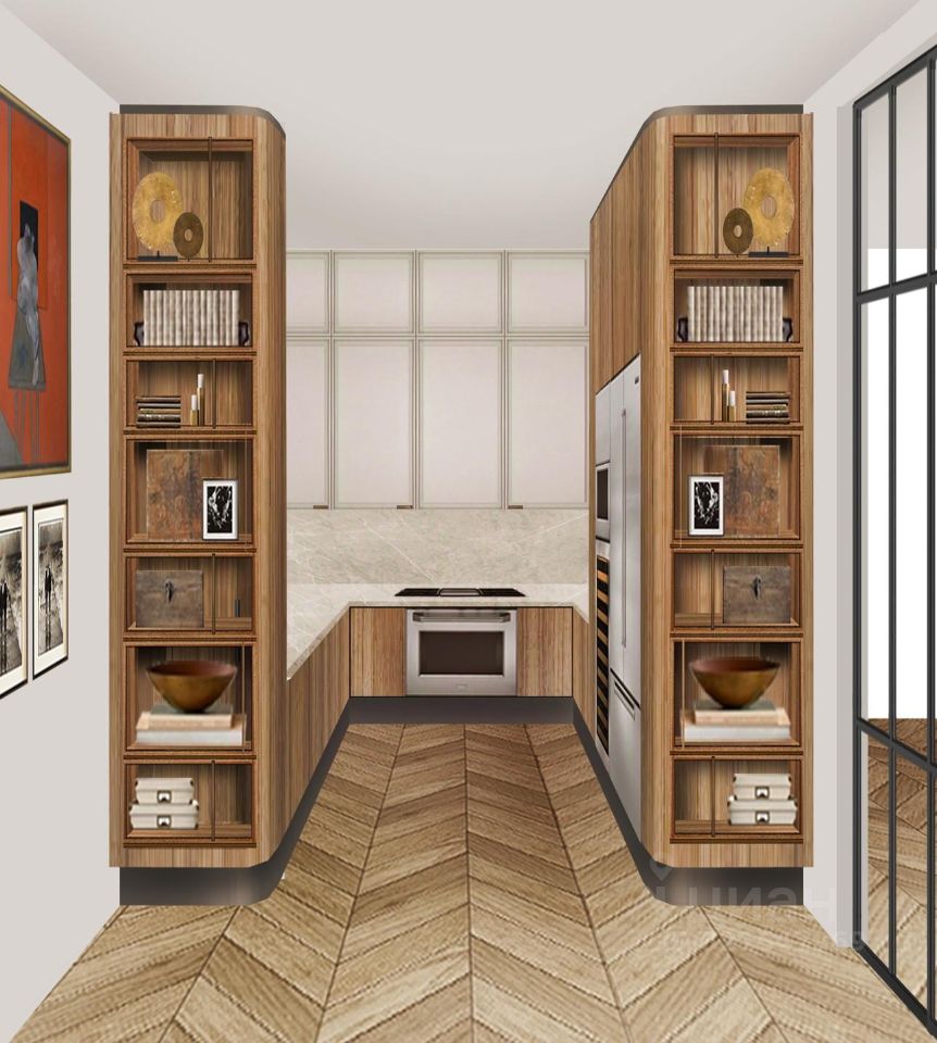 В квартире продуманная до мелочей планировка: 2 просторные гостиные, кухня, 3 спальни со своими санузлами, постирочные, гардеробные комнаты, гостевой санузел.