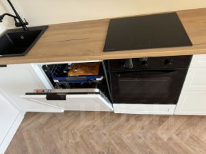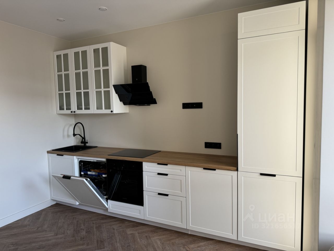 В кухонной зоне установлен качественный кухонный гарнитур со встроенной техникой, в том числе посудомоечная машина.
