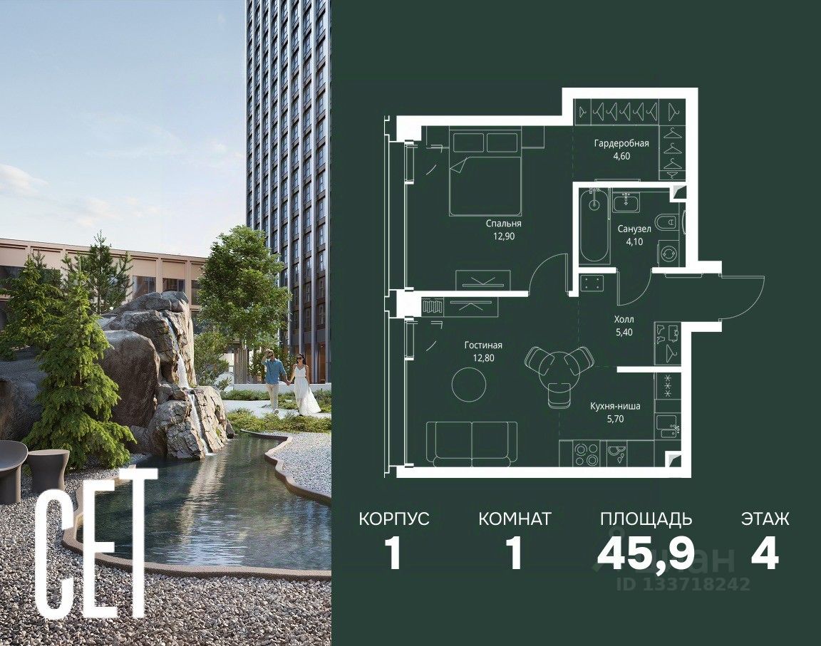 В ЖК Сет продается 1-комнатная квартира площадью 45.90 м², расположенная в корпусе 1, на 4 этаже 18 этажного дома.