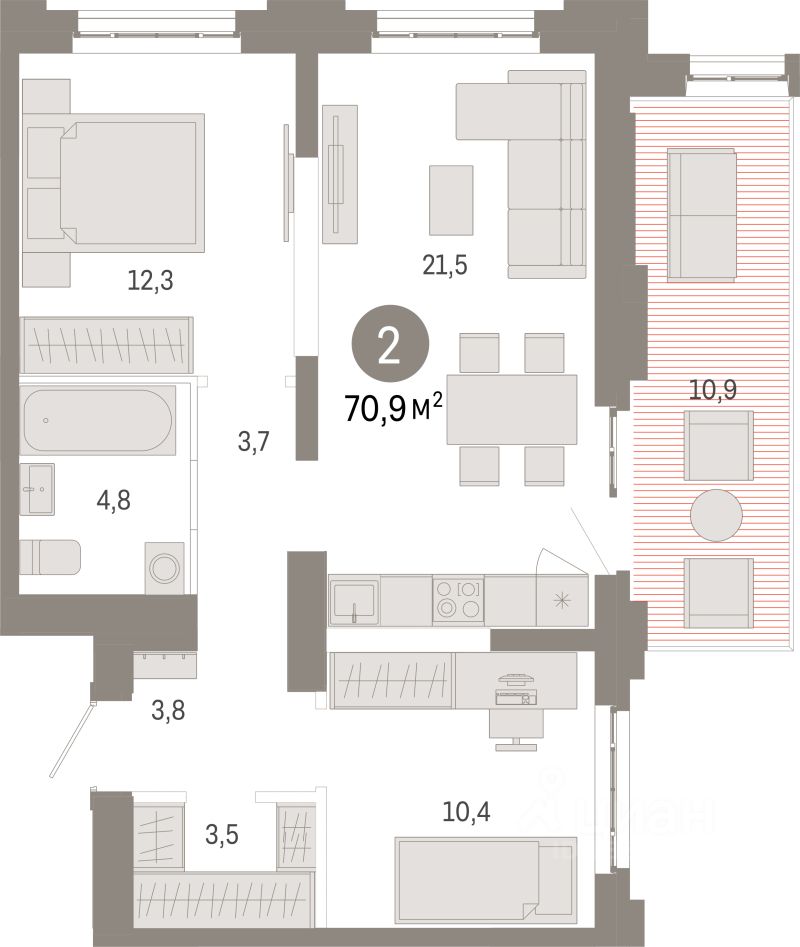 Архитекторы Брусники спроектировали несколько десятков планировочных решений. Квартиры с террасами на первых этажах, стилобате и крыше, двухуровневые пентхаусы, квартиры с мастер-спальнями, гардеробными, окнами в пол и французскими балконами.