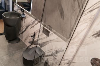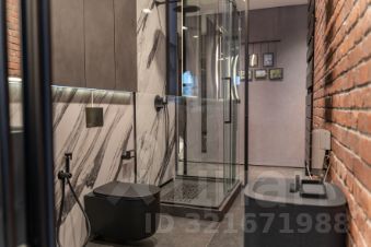Потрясающая ванная комната со стеклянными дверьми подчеркивает атмосферу лофта яркой акцентной стеной с отделкой панелями под кирпич. В дизайне пола здесь использовался керамогранит под мрамор оттенка горького шоколада, а для стен под белый итальянский мрамор ITALON, модель Charme Deluxe Floor Project Statuario Fantastico.В ванной утсновлена интересная раковина в форме лица от производителя Noken (сегодня найти такую в Мск очень сложно).