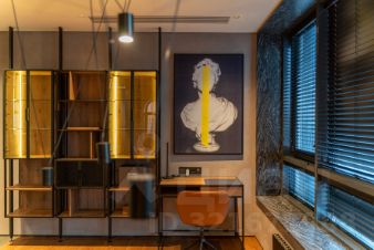 За столовой находится кабинетная зона с большой библиотекой для комфортной работы дома.