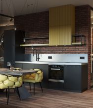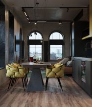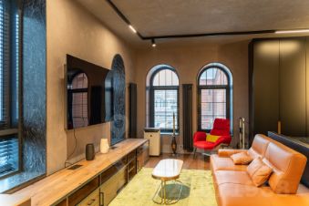 Предлагается Вашему вниманию апартаменты в стиле лофт с кирпичными стенами, черной кухней и арочными окнами с откосами и подоконниками из натурального камня.