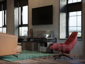 В гостиной прямо в центре апартаментов стоит кожаный диван Lennox от бренда Ditre Italia бледного тыквенного оттенка.Диван и кресло выполнены в стиле mid-century modern, который часто можно встретить в эклектичных комбинациях, характерных для американских лофтов. Напольное покрытие в спальной и гостиной зоне паркетная доска Barlinek дуб, модель Garda Medio Pure Line.