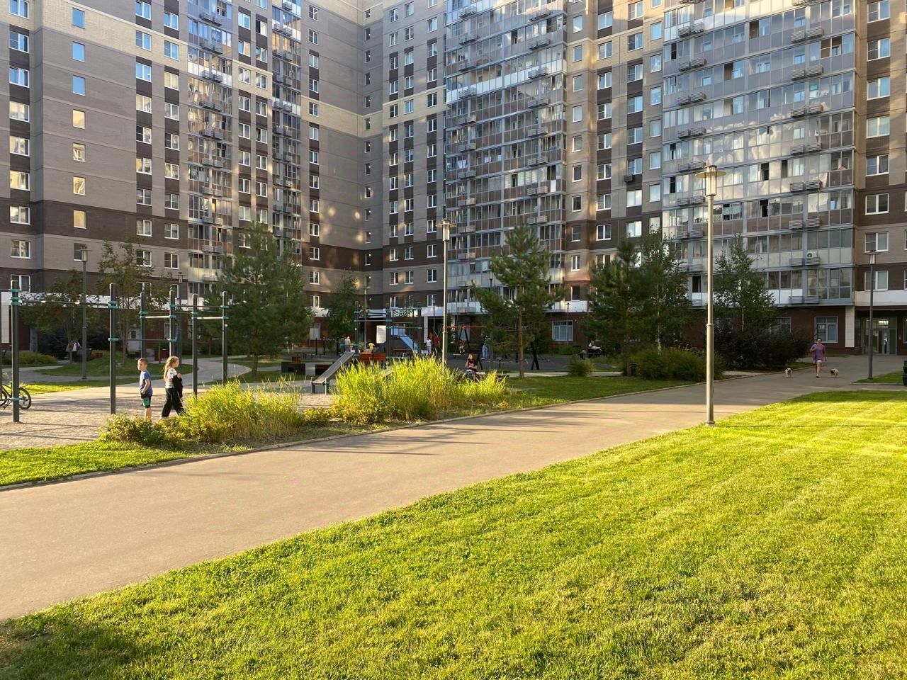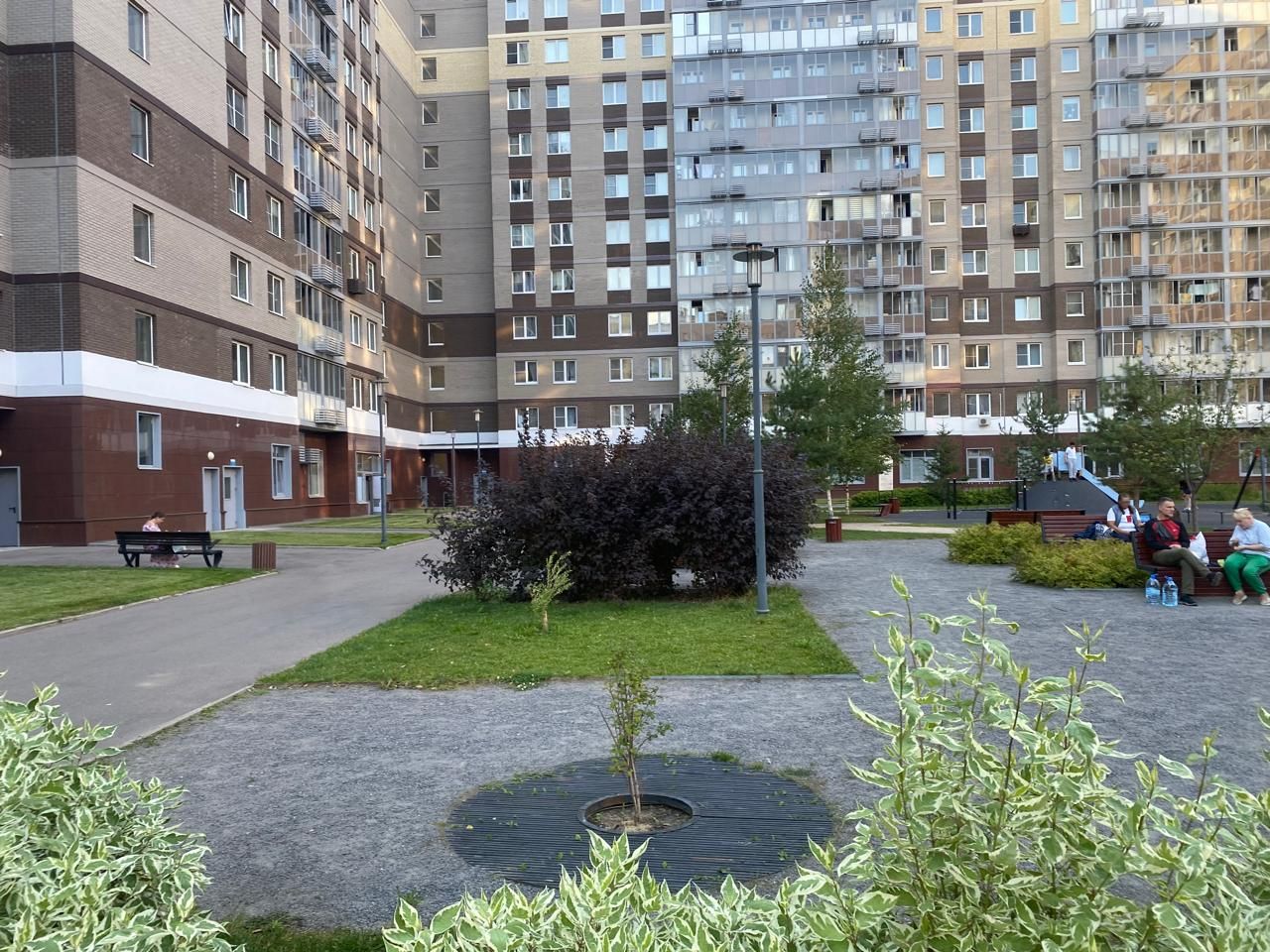 Двор без машин, подземный паркинг, детские и спортивные подростковые площадки, много мест для отдыха.