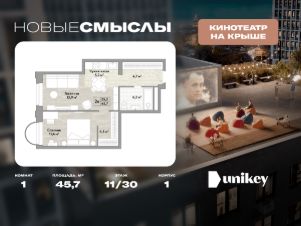 В жилом комплексе, расположенном по соседству с ландшафтным парком "Южное Бутово", продается 1-комнатная квартира площадью 45.70 кв. м. без отделки. Квартира расположена на 11 этаже 1 корпуса в жилом квартале комфорт-класса "Новые Смыслы" (ГК Unikey/Юникей).