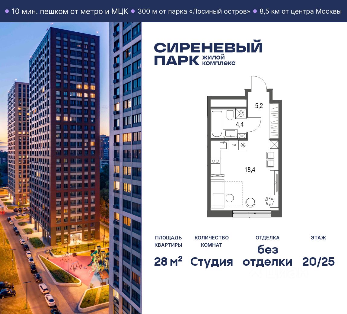Продаётся просторная студия общей площадью 28 м² на 20 этаже в новом жилом комплексе "Сиреневый парк", расположенном в Восточном административном округе Москвы на улице Тагильская. Всего 10 минут ходьбы от станции метро "Бульвар Рокоссовского" и одноимённой платформы МЦК.
