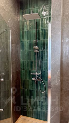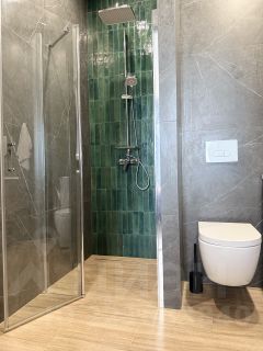 Ванная комната оборудована современной душевой кабиной — практично, компактно и удобно. Всё необходимое под рукой: качественная сантехника, удобная система хранения, дизайнерская мебель.