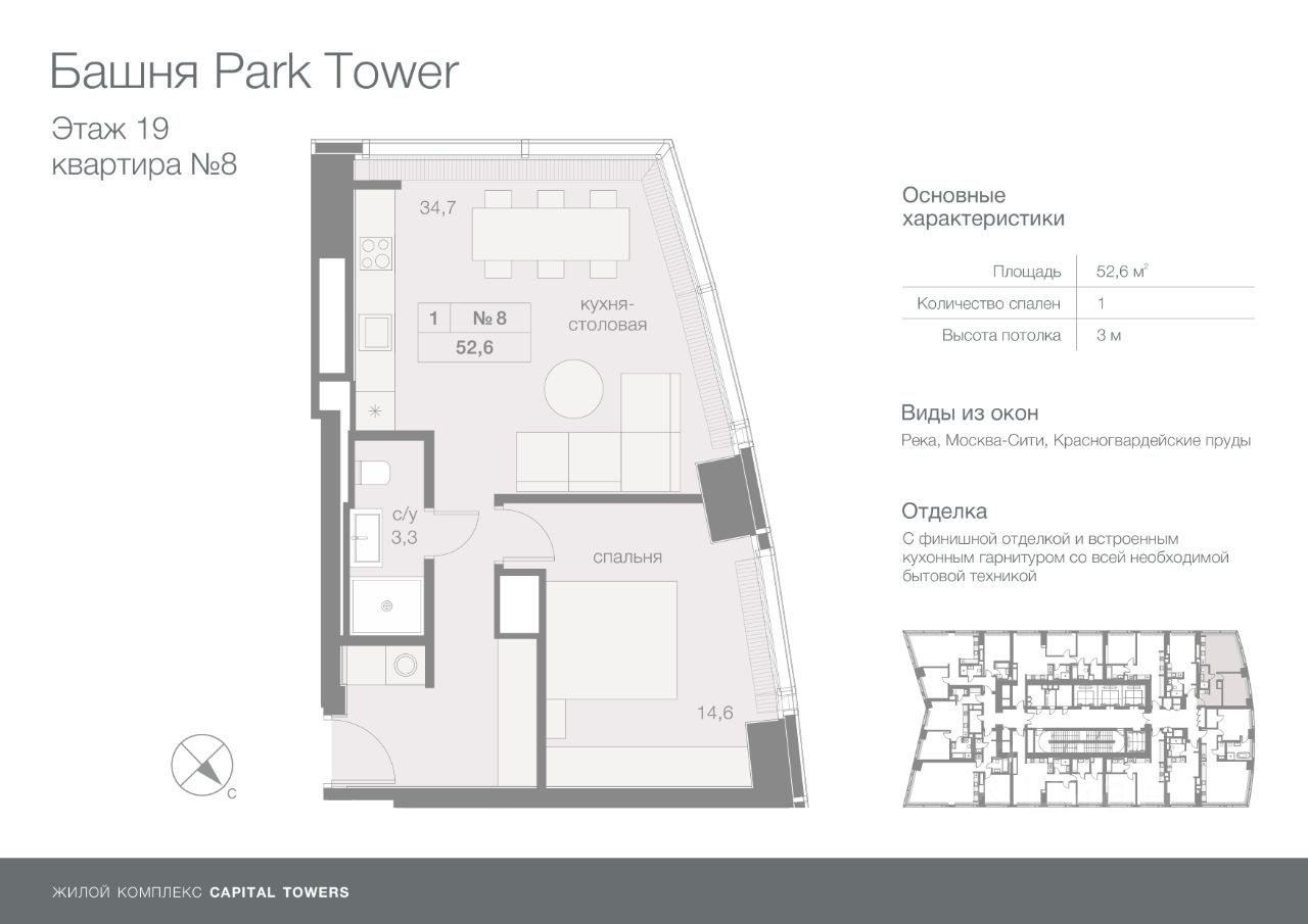 Угловая 1-комнатная квартира общей площадью 52,6 кв.м. Удачное планировочное решение позволяет организовать просторную, угловую кухню-гостиную и спальную комнату. Из панорамных окон гостиной открывается потрясающий вид на реку, башни Москва-сити, МГУ и Воробьевы горы, где вы можете наслаждаться невероятным закатом вместе с семьей или друзьями. Кухня-гостиная ориентирована на северо-запад, спальня - на север. Квартира предлагается с финишной, дизайнерской отделкой, включая встроенный кухонный гарнитур со всей необходимой бытовой техникой.