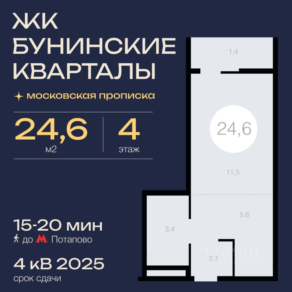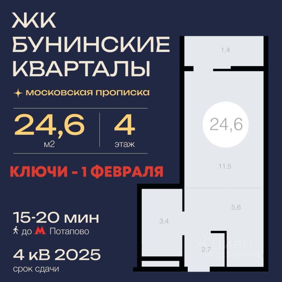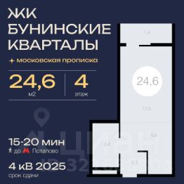 Продается студия, 24,6 м² в ЖК Бунинские кварталы