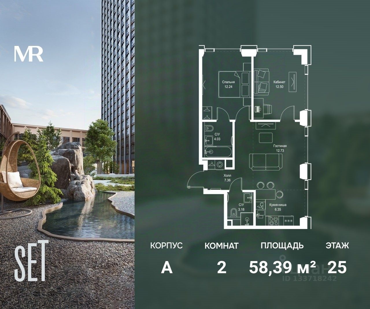 В ЖК SET продается 2-комнатная квартира площадью 58.39 м², расположенная в корпусе А, на 25 этаже 52 этажного дома.