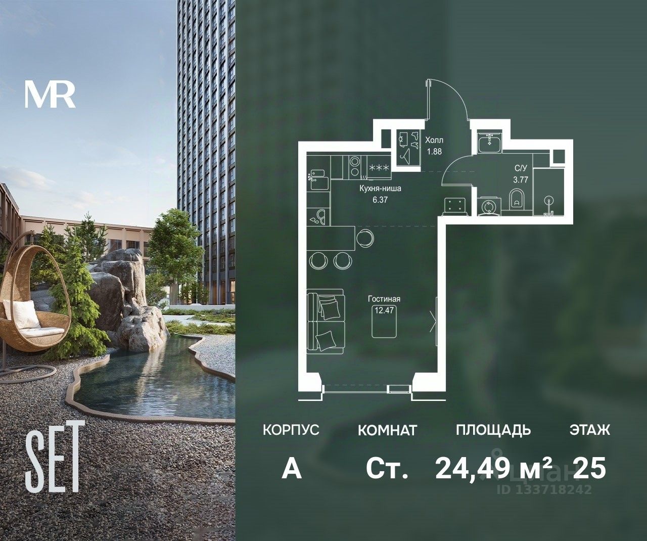 В ЖК SET продается студия площадью 24.49 м², расположенная в корпусе А, на 25 этаже 52 этажного дома.