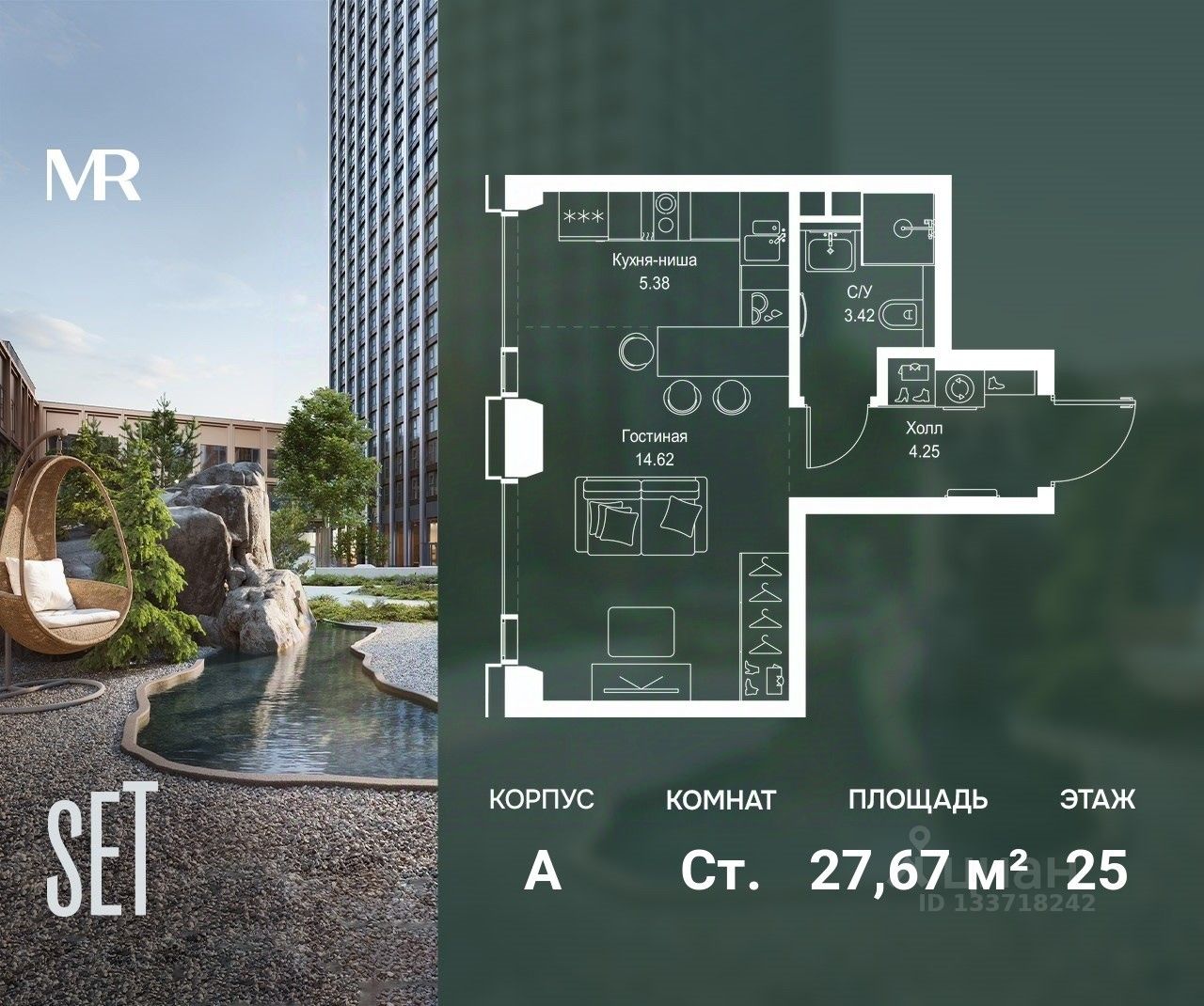В ЖК SET продается студия площадью 27.67 м², расположенная в корпусе А, на 25 этаже 52 этажного дома.
