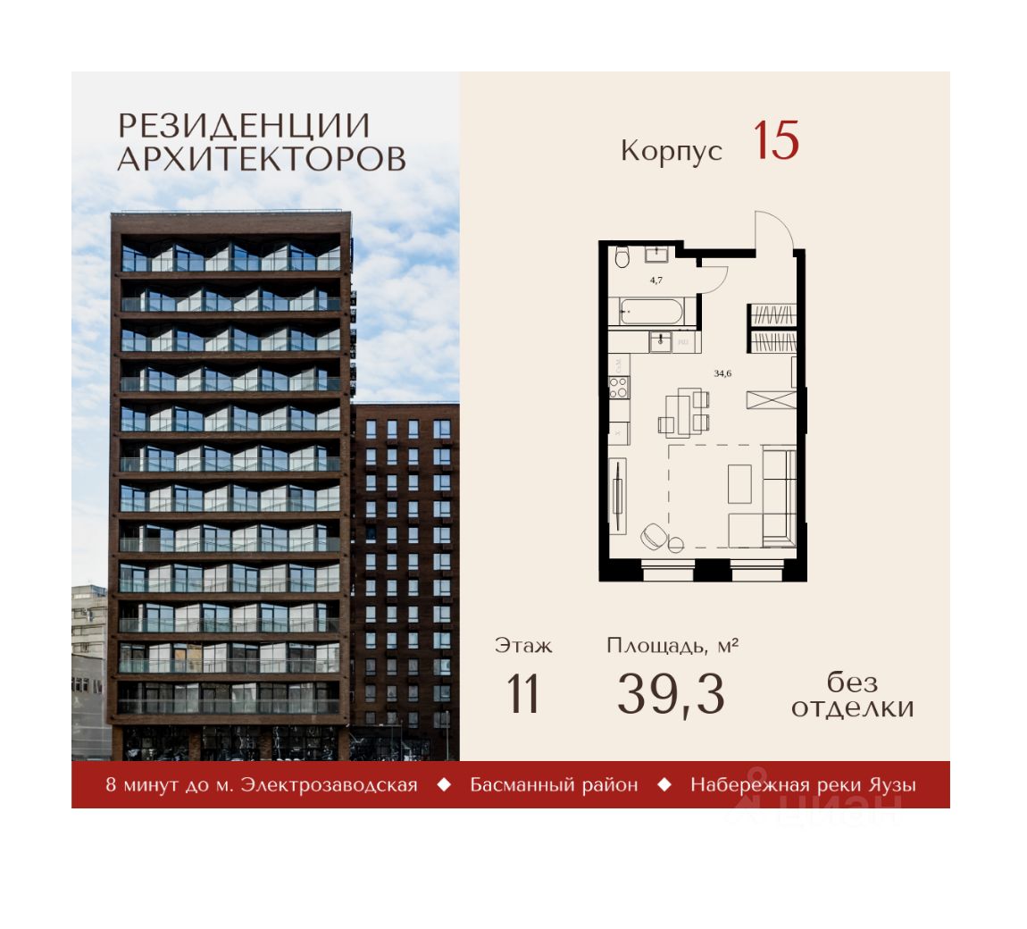 Продаются просторные 1-комнатные апартаменты общей площадью 39,3 м² на 11 этаже в сданном жилом квартале "Резиденции Архитекторов" вблизи с метро Электрозаводская и БКЛ Электрозаводская.