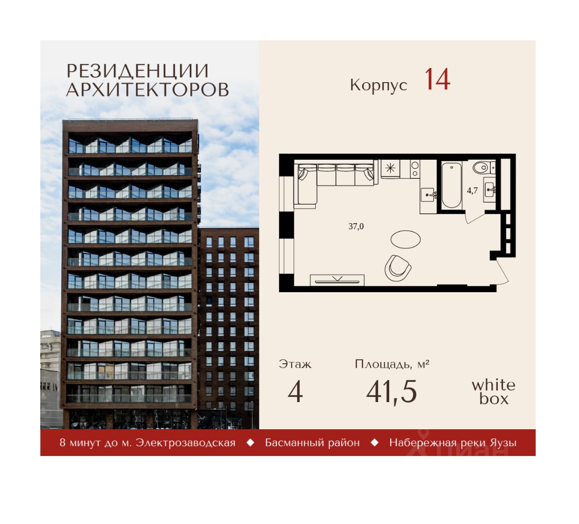 Продаются просторные 1-комнатные апартаменты общей площадью 41,5 м² на 4 этаже в сданном жилом квартале "Резиденции Архитекторов" вблизи с метро Электрозаводская и БКЛ Электрозаводская.