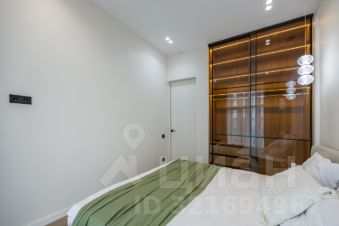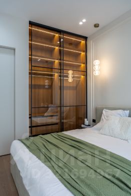 - Спальня с вместительным стеклянным шкафом для хранения одежды .