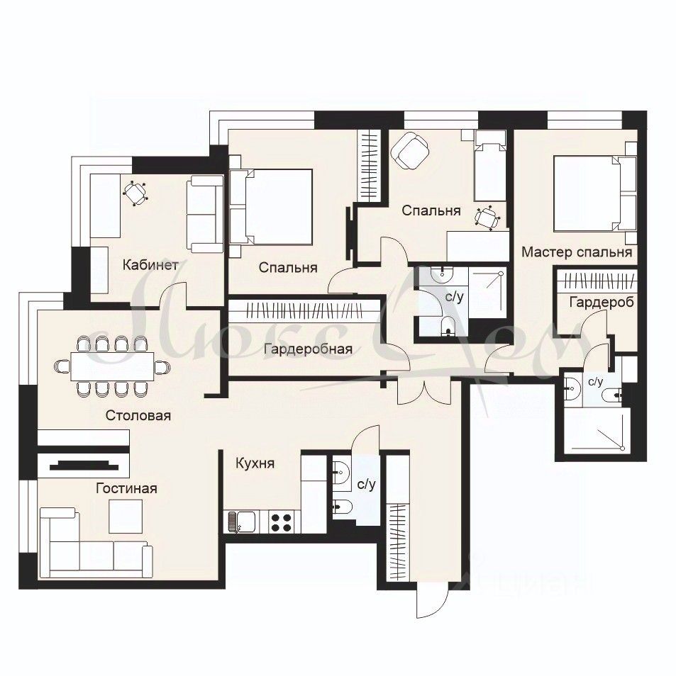 - предполагает до 5 изолированных комнат. Оптимальным вариантом станет: кухня-гостиная, 3-4 спальни и/или кабинет, постирочная, 3 с/у. Но вы можете спланировать пространство по своему вкусу.