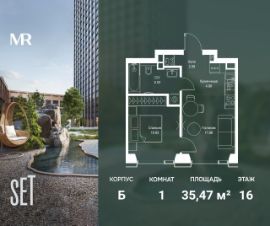 В ЖК SET продается 1-комнатная квартира площадью 35.47 м², расположенная в корпусе Б, на 16 этаже 59 этажного дома.