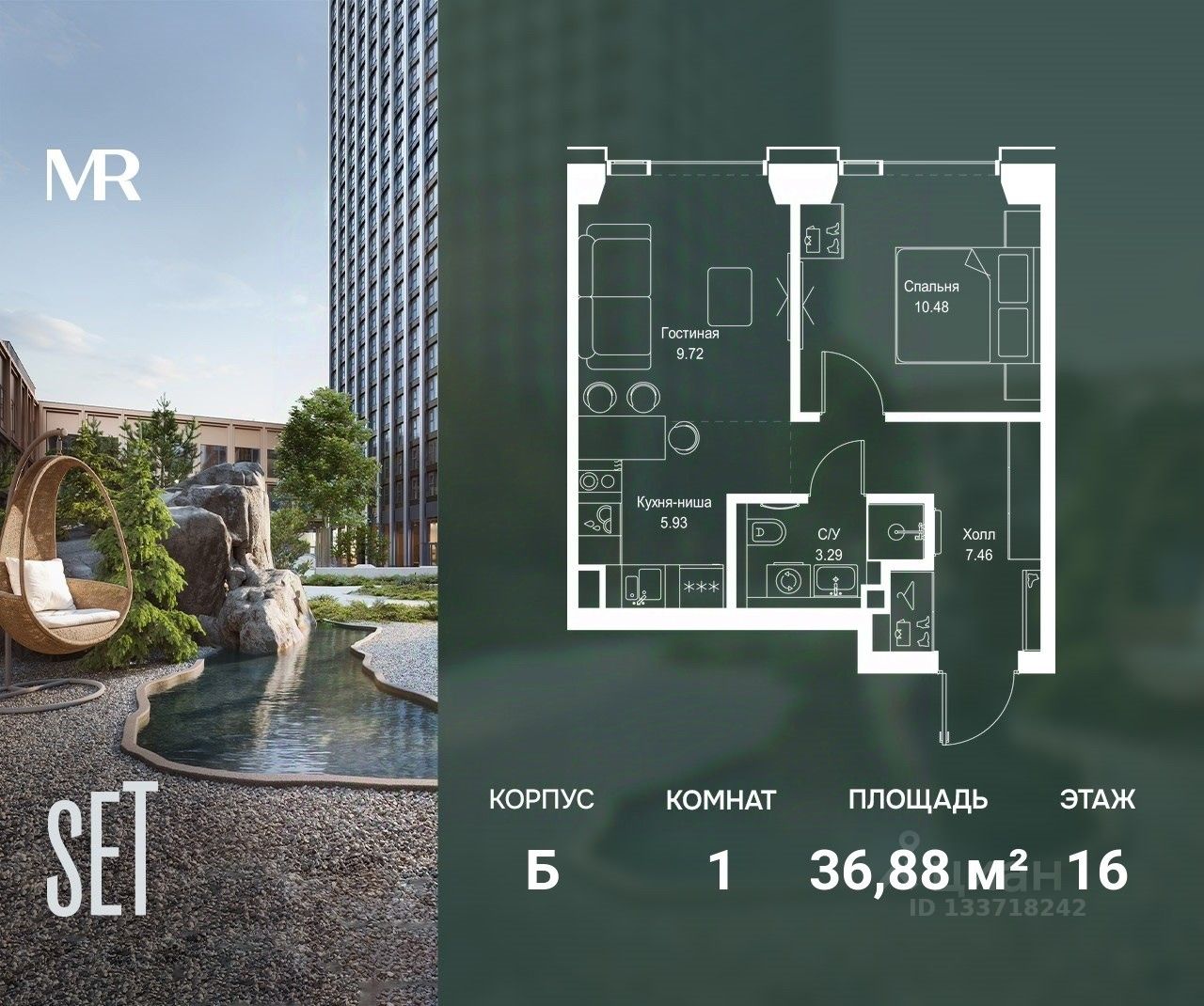 В ЖК SET продается 1-комнатная квартира площадью 36.88 м², расположенная в корпусе Б, на 16 этаже 59 этажного дома.