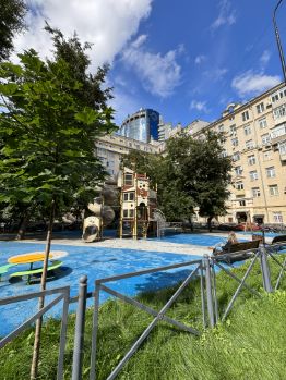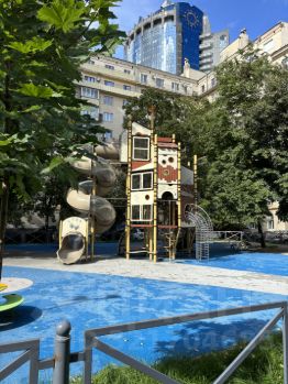 Во дворе дома красивая детская площадка и школа 56 В.А Легасова.