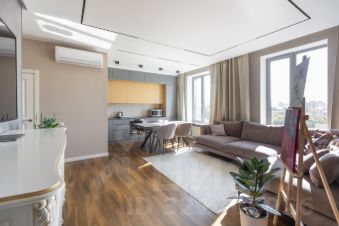 • Раздельные комнаты: мастер-спальня (17,2 м²) с ванной, вторая спальня (12 м²), детская (12 м²), просторная кухня- гостиная (25 м²) с тремя панорамными окнами