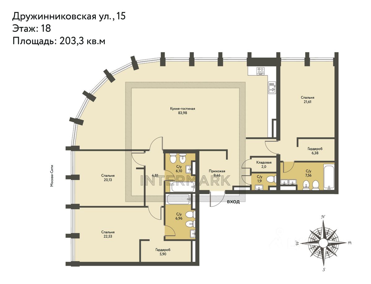 Удачная планировка: кухня-гостиная с 8-ю радиусными окнами в пол, 2 мастер-спальни с собственными ванными комнатами и гардеробными, 3-я спальня с ванной комнатой, холл, кладовая, гостевой с/у.