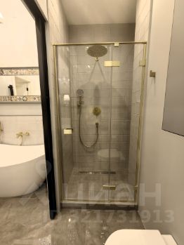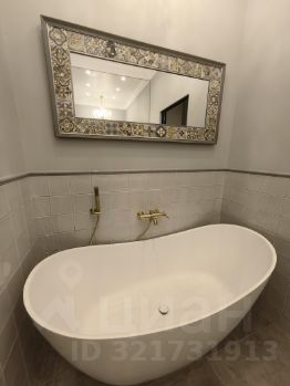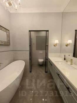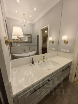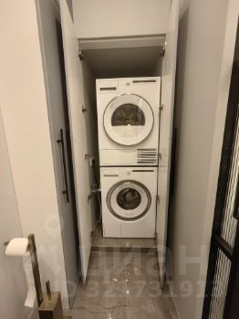 Безусловной изюминкой данной квартиры является просторный санузел, где вы можете расслабиться в ванне из литого мрамора, созерцая люстру из хрусталя и дизайнерское зеркало с плитками ручной росписи в деревянном итальянском багете, выполненном специально на заказ для этой квартиры. В санузле также есть душевая кабина и постирочный шкаф, включающий в себя стиральную и сушильную машины премиального шведского бренда ASKO. Зона душевой кабины, унитаза и постирочной отделена от ванной раздвижными дверями.