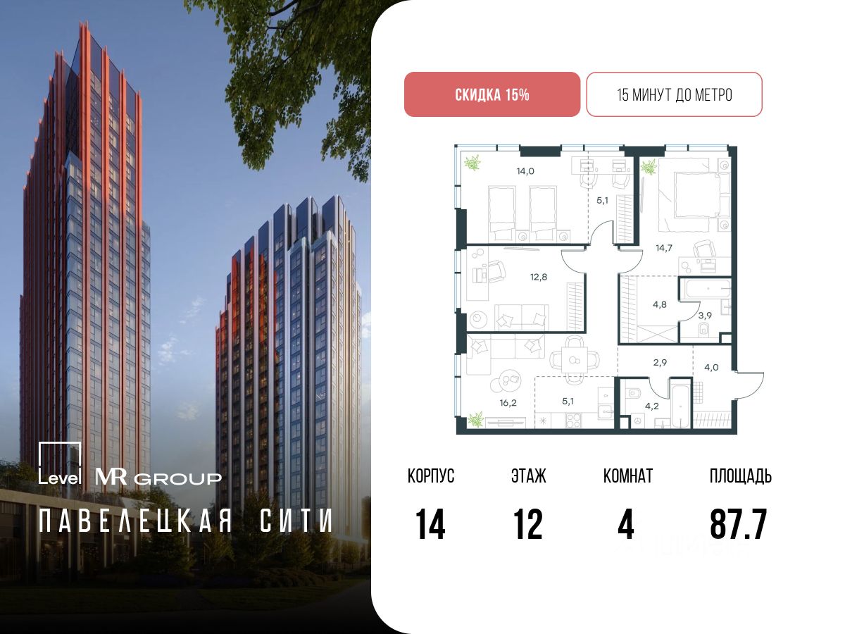 В Даниловском районе столицы (ЮАО) продаётся 4-комнатная квартира площадью 87.70 кв.м без отделки. Квартира расположена на 12 этаже -этажного корпуса 'Горизонт' в жилом комплексе бизнес-класса Павелецкая Сити. Высота потолков 3.00м. Престижная локация "Павелецкая Сити" - жилой комплекс бизнес-класса, расположенный в престижном Даниловском районе Москвы, на границе с ЦАО. Проект находится в историческом центре города в окружении парков, Москвы-реки и сформированной инфраструктуры. В пределах 20 минут пешком есть 3 станции метро, а в 5 минутах езды на авто - ТТК и Садовое кольцо. - 15 мин. пешком до метро "Павелецкая"; - 20 мин. пешком до станций "Тульская" и "Серпуховская"; - 8 мин. на авто до Кремля; - 10 мин. на авто до парка Горького и парка "Зарядье"; - 20 мин. на авто до башен "Москва-Сити". Авторская архитектура Архитектурная концепция разработана бюро СПИЧ по индивидуальному проекту. Облик корпусов I и II очередей отсылает к стилистике архитектуры классического Нью-Йорка и золотой эпохи Голливуда. Корпуса IV очереди вдохновлён эстетикой ар-деко в её современном переосмыслении. Благодаря линейному расположению корпусов из большинства квартир будут открываться потрясающие виды на исторический центр города и Москву-реку. Дизайнерские лобби Изысканные интерьеры лобби жилого комплекса отсылают к классическим фильмам золотой эпохи Голливуда. Классика в "Павелецкая Сити" - не имитация, а современное осмысление лучшего в этом стиле. В каждом вестибюле оборудованы стойки ресепшен, комфортные зоны ожидания, гостевые санузлы, мойки для лап животных, колясочные. В корпусах по 3-4 лифта, включая сервисный, с прямым доступом в паркинг. Площадь лобби - от 47,9 до 114,9 кв. м, высота потолков - до 5,46 м. Благоустройство и инфраструктура Для создания благоустройства было приглашено 2 ведущих бюро - ADM и GAFA. Разноуровневое пространство вмещает всё необходимое для качественного досуга: игровые площадки для детей всех возрастов, тропы здоровья для пеших прогулок, крытые аллеи с качелями, места для работы на свежем воздухе, многофункциональные спортивные площадки - воркаут-зоны, столы для пинг-понга, зоны командных игр. Общая площадь закрытого двора - 4,63 га. Комфорт - это когда рядом всё, что нужно для жизни. На первых этажах и в стилобатной части корпусов "Павелецкая Сити" размещены 85 коммерческих помещений, где откроются супермаркеты, кафе, пекарни, аптеки и другие службы сервиса. В составе проекта также предусмотрены собственный фитнес-клуб и развивающий центр Letovo Kids, а также школа на 720 мест и детский сад на 175 мест. Технологии и безопасность - Wi-Fi в лобби и на придомовой территории; - Автоматизированная система контроля и учета ресурсов; - Круглосуточное видеонаблюдение и охрана; - Круглосуточная связь с охраной через приложение, телефон или кол-центр; - Контроль доступа по биометрической системе Face-ID; - Усиленный сотовый сигнал в лифтах и паркинге; - Распознавание номеров автомобилей при въезде/выезде в/из паркинга.