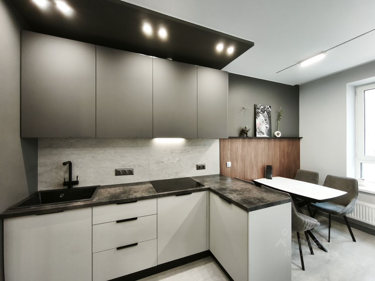 Зона кухни-гостиной "зонирована" удобным мягким диваном, и пространство можно легко менять по вашему вкусу.