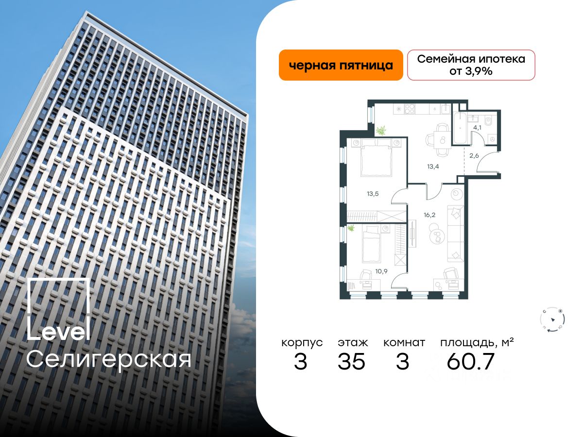 В жилом квартале, расположенном в южной части района Западное Дегунино, продаётся 3-комнатная квартира площадью 60.70 кв.м без отделки. Квартира расположена на 35 этаже 40-этажного корпуса Корпус 3 в жилом комплексе комфорт-класса Level Селигерская (компания Level Group/Левел групп).