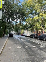 Благоустроенный зеленый двор, есть детская площадка, выделены парковочные места.