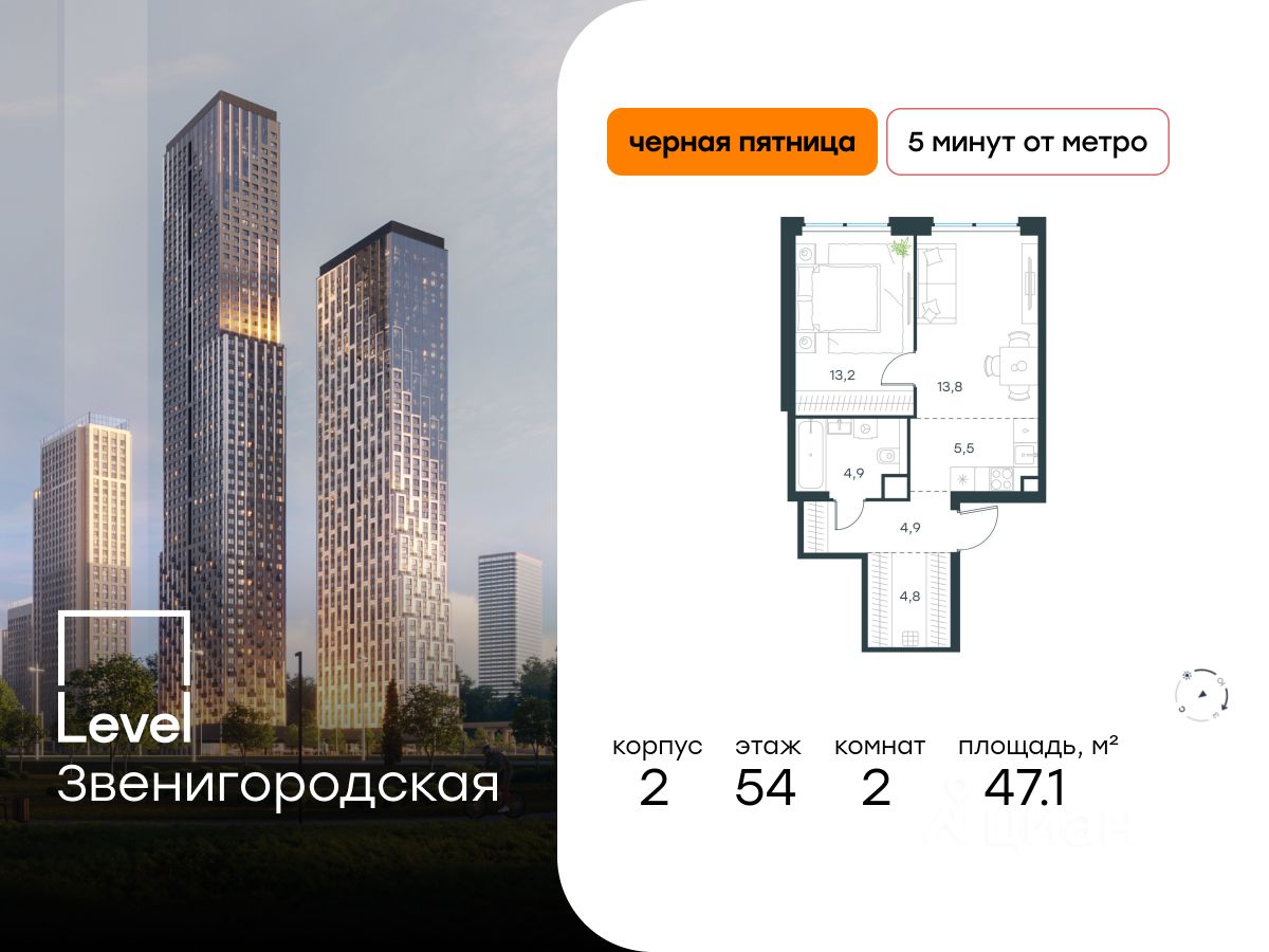В престижном районе Хорошёво-Мнёвники продаётся 2-комнатная квартира площадью 47.10 кв.м нет. Квартира расположена на 54 этаже 64 этажного корпуса Корпус 2 в жилом комплексе класса комфорт+ Level Звенигородская (компания Level Group/Левел групп).