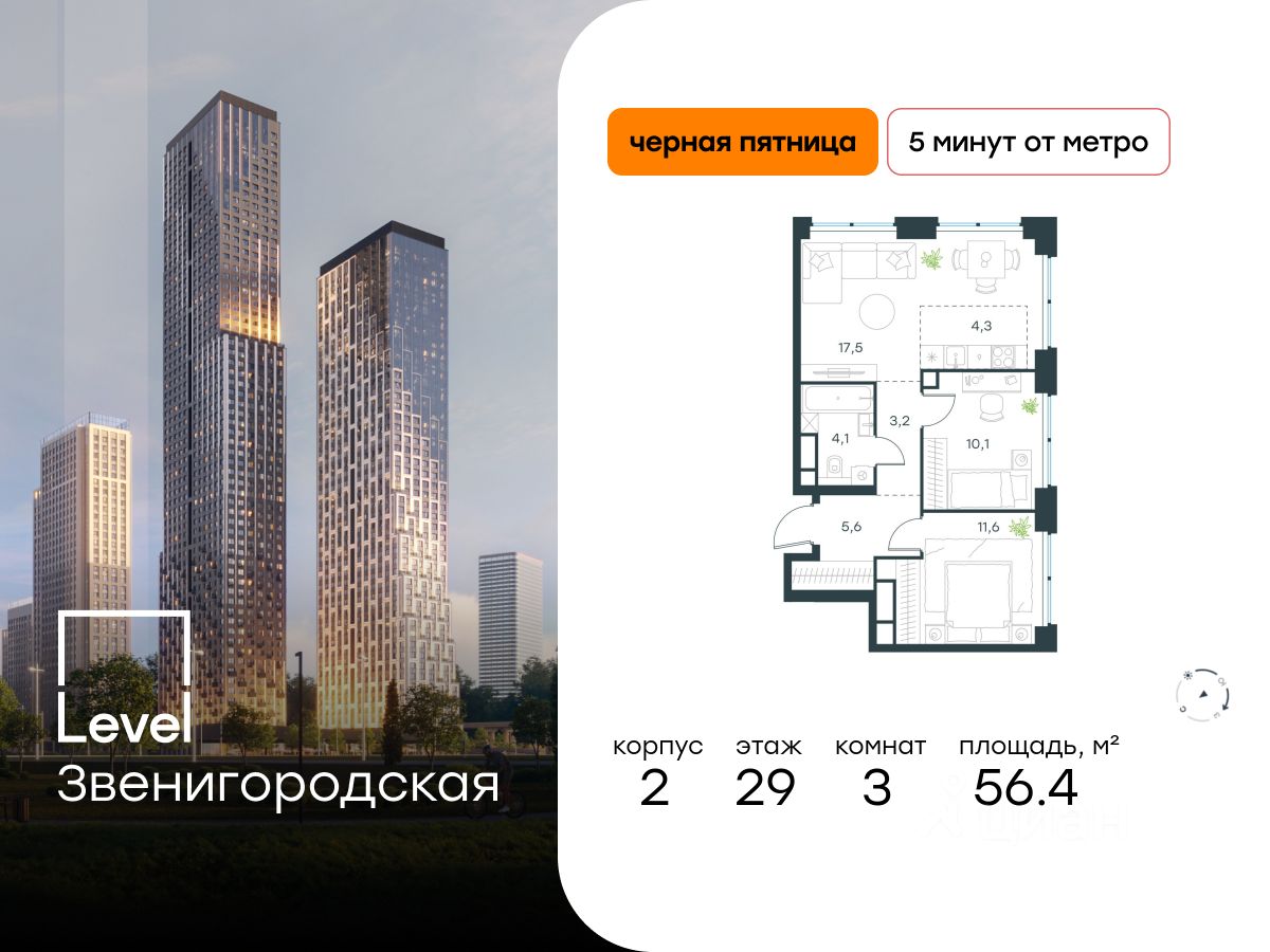 В престижном районе Хорошёво-Мнёвники продаётся 3-комнатная квартира площадью 56.40 кв.м нет. Квартира расположена на 29 этаже 64 этажного корпуса Корпус 2 в жилом комплексе класса комфорт+ Level Звенигородская (компания Level Group/Левел групп).