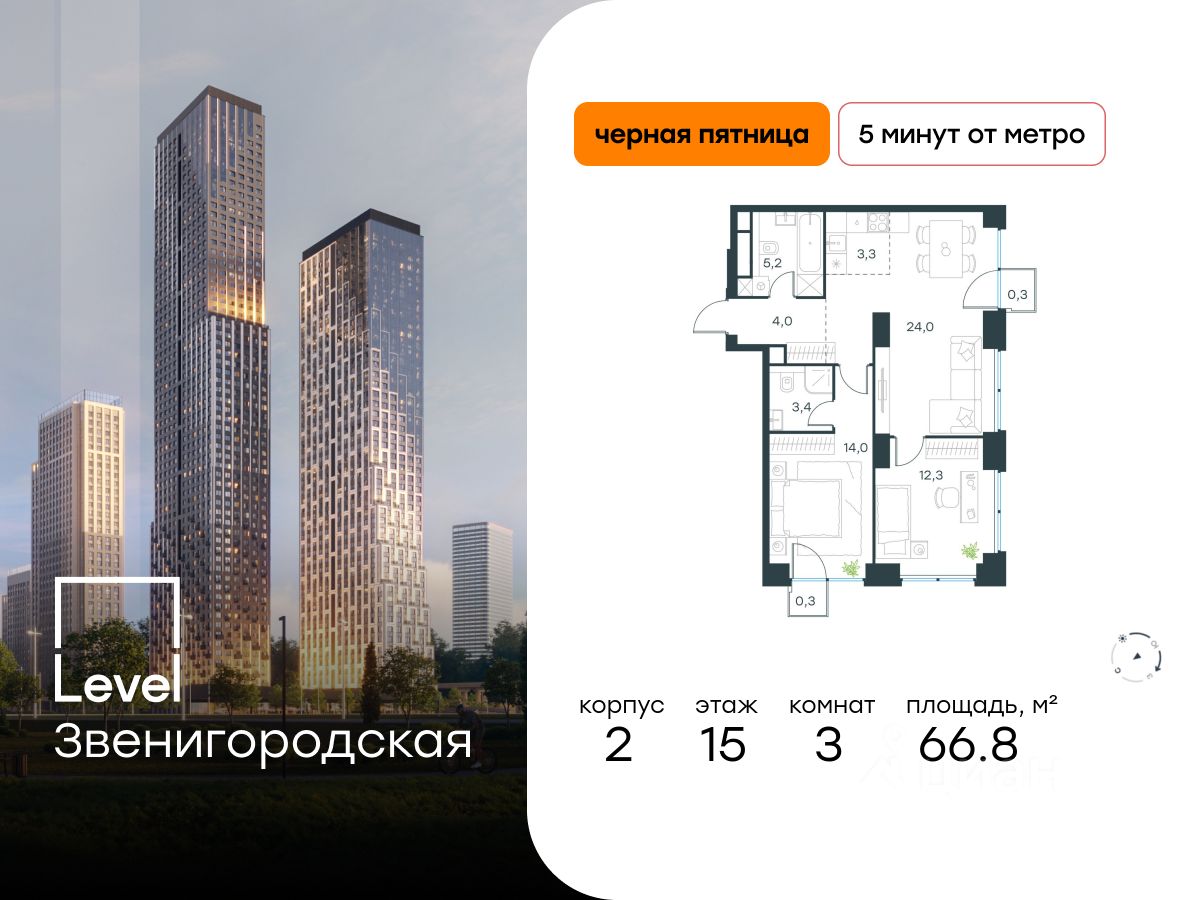 В престижном районе Хорошёво-Мнёвники продаётся 3-комнатная квартира площадью 66.80 кв.м нет. Квартира расположена на 15 этаже 64 этажного корпуса Корпус 2 в жилом комплексе класса комфорт+ Level Звенигородская (компания Level Group/Левел групп).