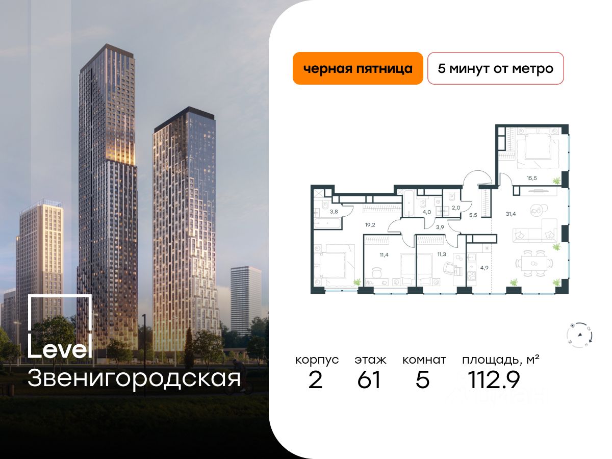 В престижном районе Хорошёво-Мнёвники продаётся многокомнатная квартира площадью 112.90 кв.м нет. Квартира расположена на 61 этаже 64 этажного корпуса Корпус 2 в жилом комплексе класса комфорт+ Level Звенигородская (компания Level Group/Левел групп).