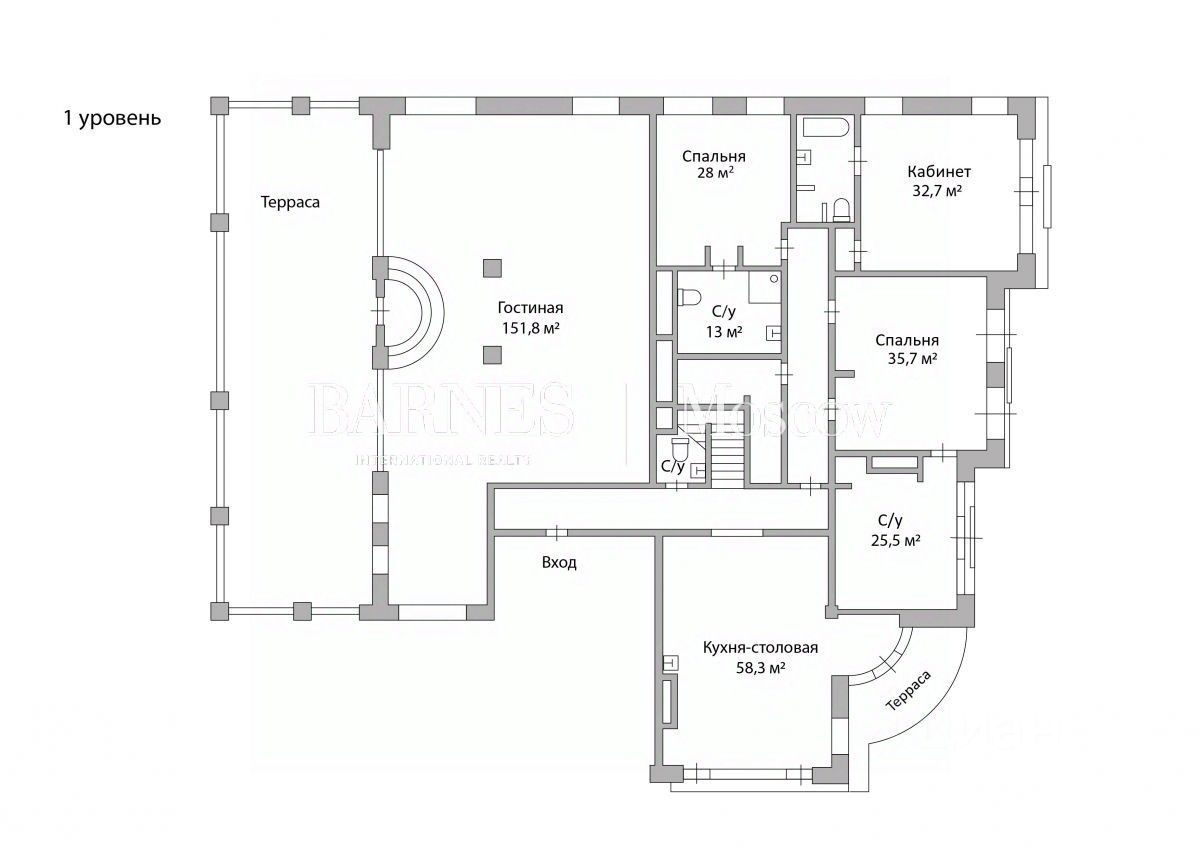 1 уровень: гостиная с камином, библиотекой и выходом на большую террасу, кухня-столовая с малой террасой, 2 спальни, кабинет, 4 санузла.