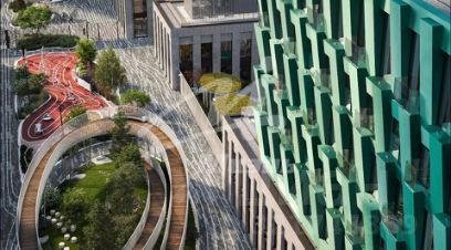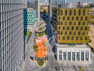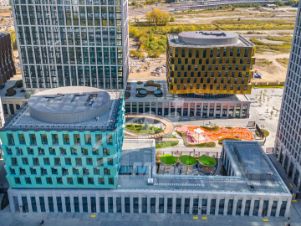 Проектом предусмотрено многоуровневое благоустройство территории с зонами для прогулок и детскими площадками. Фитнес центр, скульптурный парк, джаз-гостиная. Смотровые площадки на крышах небоскребов для жителей комплекса.
