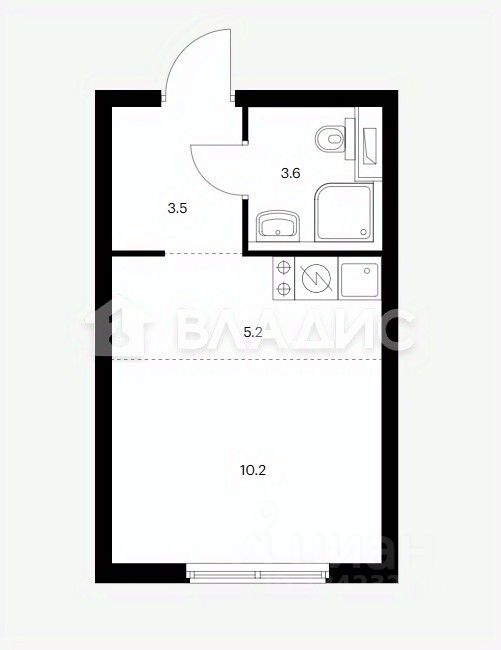 Общая площадь студии составляет 22,6 квадратных метра, из которых 16 кв. м — жилая площадь и 3 кв. м — кухня. Высота потолков — 3 метра, что придаёт пространству дополнительный объём и свободу.