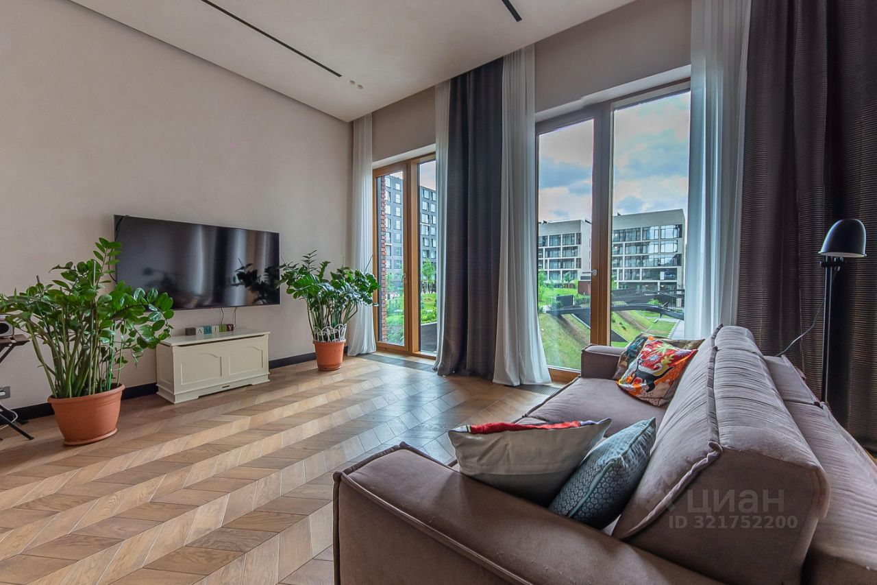 Квартира с панорамными окнами, из которых открывается вид на внутреннюю территорию комплекса.
