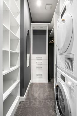 Правильно распланированная гардеробная спокойно вместит в себя все личные вещи. Там же,для комфортного быта расположены стиральная и сушильные машины фирмы Miele.