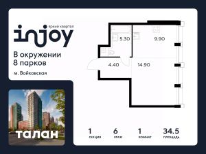 Прямая продажа от застройщика. В жилом квартале, расположенном в Войковском районе Москвы, продаётся 1-комнатная квартира площадью 34.5 кв.м без отделки. Квартира расположена на 6 этаже 35-этажного дома, корпус 1, в жилом квартале бизнес-класса INJOY.